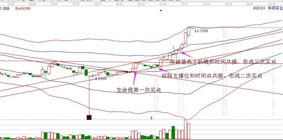 在上面的圖形中,個(gè)股在拉升過程中,有幾次的調(diào)整,我們可以看到在第一次從生命線開始上漲時(shí),個(gè)股壓力位調(diào)整,回踩支撐位附近和輪中輪變盤點(diǎn)的時(shí)間窗共振,時(shí)間和支撐位共振形成二次買點(diǎn)。然后再次開啟拉升,一路向上突破極反通道藍(lán)色上軌線位置,再次和輪中輪變盤點(diǎn)的時(shí)間窗共振,形成了三次買點(diǎn)。按照極反通道操作規(guī)則,站穩(wěn)一線看高一線,生命線啟動(dòng),第一目標(biāo)位就是藍(lán)色上軌線位置,突破藍(lán)色上軌線,第二目標(biāo)位就是紅色上軌線位置。按照這樣的分析,步步為營,不好高騖遠(yuǎn),只要趨勢不變就可以持續(xù)持股,因此咱們贏家才能安心的持股華資實(shí)業(yè)至當(dāng)下。