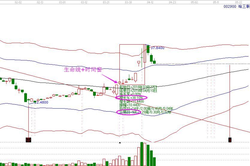 生命線和時間窗共振的位置啟動,上藍(lán)色上軌線位置,再到紅色上軌線位置,之后從紅色上軌線開始回落,走出一波完整的上漲波段。3月27日至4月10日高點(diǎn),共9個交易日,漲幅空間近40%,生命線+時間窗盈利模型完美驗(yàn)證。