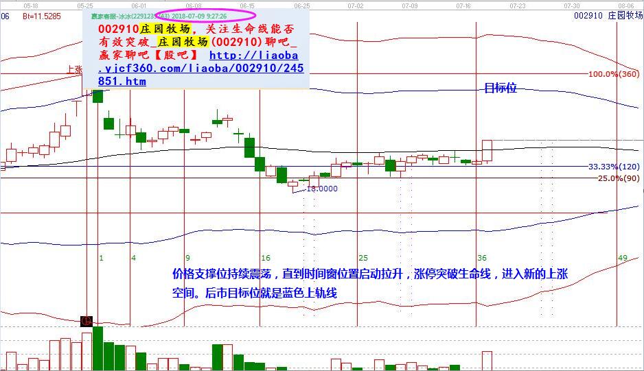 莊園牧場:9號依據(jù)時價共振選出,在百分比33.33%和生命線區(qū)間震蕩,截止目前漲幅在12%左右。今天漲停向上突破生命線進入新的上漲空間,后市上漲目標位就是極反通道藍色上軌線位置。