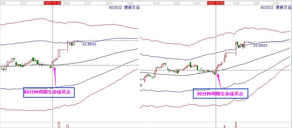 生命線最佳買(mǎi)點(diǎn):在30分鐘和60分鐘周期中,個(gè)股在31號(hào)都處于生命線位置,符合生命線最佳買(mǎi)點(diǎn)操作規(guī)則。