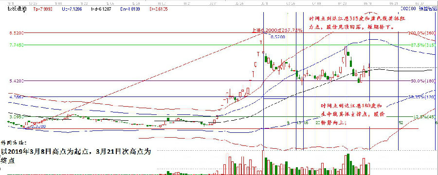 筆者將兩組時間圖形融合在一起,可以看到關(guān)鍵的啟動點2019年2月20日突破趨勢向上,開啟快速拉升行情;5月9日為兩組時間工具的共振時間點,股價從生命線拉起漲停,開啟新一輪的上漲。具體不再細(xì)說。