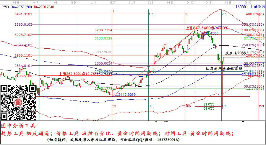 調(diào)整階段,選取的是兩個臨近的高點,從圖中可以看到4月16日時間窗口股價回探到生命線和江恩180度支撐,形成共振,市場轉(zhuǎn)勢向上;4月25日時間窗口股價上攻到極反通道藍(lán)色線和江恩315度阻力點,形成共振,股價見頂回落,短期下行。