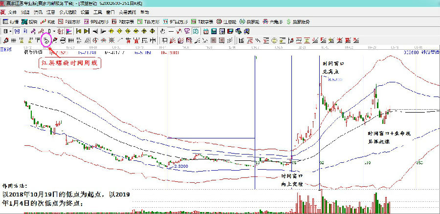 本周帶大家學(xué)習(xí)一個預(yù)判時間窗口的工具-江恩螺旋時間周期線。時間分析是有江恩首次引入到金融市場中,開啟了金融市場技術(shù)分析的新方向,江恩理論認(rèn)為,時間是決定市場走勢的最重要因素,而經(jīng)過我們的長期實戰(zhàn),發(fā)現(xiàn)當(dāng)時間和價格形成四方時,市場會發(fā)生趨勢的反轉(zhuǎn),或出現(xiàn)大陰大陽的劇烈波動,同時伴隨著成交量的放大。我們進行時間分析,最重要的目的是判斷市場是處于上漲或下跌趨勢的什么階段,根據(jù)價格做好下一步走勢方向的預(yù)判。江恩螺旋時間周期線就是這樣的一個具備超強實戰(zhàn)意義的時間分析工具。接下來,筆者以兩個股票的具體走勢為例做個展示幫助大家了解該工具的具體應(yīng)用。