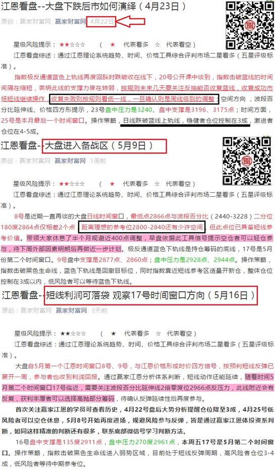 大盤五一節(jié)后的反彈,在5月17日時(shí)間窗口宣告結(jié)束。贏家江恩從4月22日盤中明確提示風(fēng)險(xiǎn),到等待5月8日-9日時(shí)間窗口備戰(zhàn)交易,并于2800-2840區(qū)間進(jìn)行短線抄底建倉(cāng),到5月17日2966點(diǎn)附近見頂回落。投資者再次經(jīng)歷了一次市場(chǎng)的完美漲跌,從0到360度完成一個(gè)漲跌循環(huán)。對(duì)于市場(chǎng)的判斷,贏家大勢(shì)分析都有展示,在此我們做下回顧。