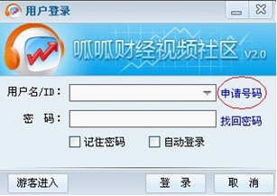 第三步:安裝好后桌面出現(xiàn)"呱呱財(cái)經(jīng)視頻社區(qū)",雙擊,點(diǎn)擊申請?zhí)柎a。申請?zhí)柎a,像QQ一樣,號碼申請完畢后記住號碼,然后登陸大廳