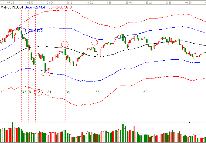 以上證指數(shù)為例,對(duì)此工具的畫法做一個(gè)演示。首先我們要用鼠標(biāo)選中費(fèi)氏時(shí)間循環(huán)線這個(gè)工具的圖標(biāo),點(diǎn)擊左鍵,我們?cè)谶x點(diǎn)的過程中可以根據(jù)個(gè)人的經(jīng)驗(yàn)來選擇它的點(diǎn)位,高點(diǎn)或者是低點(diǎn),那么我下面就選擇一下這個(gè)一個(gè)小波段的高點(diǎn),2009年8月4號(hào)這一天點(diǎn)位3478點(diǎn)),這個(gè)工具的操作也是很簡(jiǎn)單的,點(diǎn)擊鼠標(biāo)左鍵,在你選擇起點(diǎn)的這個(gè)位置即可,我們可以看一下,費(fèi)氏時(shí)間循環(huán)線,它是以費(fèi)波納奇神奇數(shù)字排開的,1,2,3,5,8、13、21,一只向后延伸。那么以前我們有講過,如果幾個(gè)同等重要的時(shí)間點(diǎn)位形成共振的情況下,下一條所提示的時(shí)間點(diǎn)位就為重要的時(shí)間之窗,應(yīng)該給予關(guān)注。