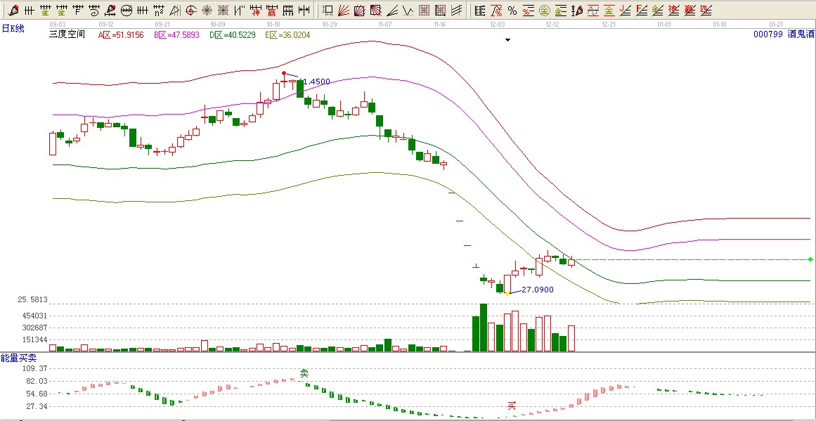 酒鬼酒用三度空間12.04日發(fā)出黃色見(jiàn)底信號(hào),一路突破了E區(qū)沒(méi)以前處于D區(qū)壓力位置