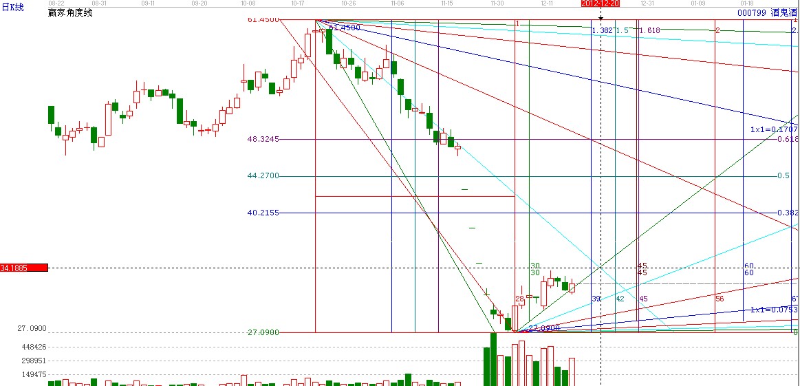 酒鬼酒用贏家角度線看盤:酒鬼酒目前處于角度線上方下一時(shí)間在12.20日角度線交匯處這里壓力34.3的位置