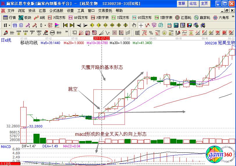 在股市中想要買(mǎi)入或者賣(mài)出任何一只股票,都需要經(jīng)過(guò)一些形態(tài)的研究和分析,接下來(lái)我們講解的第一則實(shí)例冠昊生物(300238)在2011年7月25日的走勢(shì)變化,從圖中可以發(fā)現(xiàn),在股價(jià)低位出現(xiàn)陰線(xiàn)十字星形態(tài)之后,股價(jià)前期的趨勢(shì)發(fā)生轉(zhuǎn)變,之后出現(xiàn)了光頭光腳的漲停板形態(tài),在第二個(gè)交易日的時(shí)候出現(xiàn)向上的跳空形態(tài),并出現(xiàn)了放量的走勢(shì)形態(tài),說(shuō)明形成的是螺旋槳K線(xiàn)形態(tài),將兩者的形態(tài)相結(jié)合,形成的就是“天鷹開(kāi)路”形態(tài),在該跳空沒(méi)有回補(bǔ)的形態(tài)處,投資者可以進(jìn)行積極的介入操作,等待后市的上漲行情。
