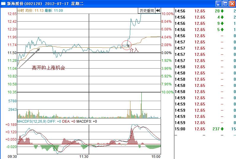 這個(gè)時(shí)候結(jié)合該股當(dāng)天的分時(shí)圖走勢(shì),該股在開(kāi)盤(pán)之后出現(xiàn)了高開(kāi)的形態(tài),而且量能放大,是一個(gè)上漲的介入機(jī)會(huì),所以投資者可以及時(shí)的介入,等待后市的上漲變化。