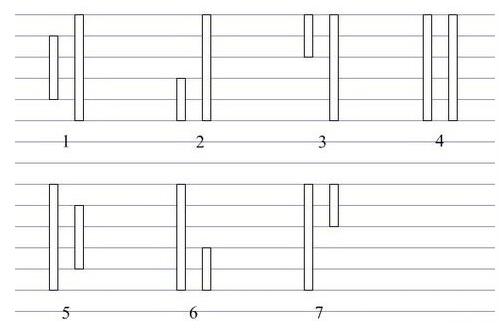 包含關(guān)系也就是一K線的高低點(diǎn)全在另一K線的范圍里,可以用下邊圖中的7種形態(tài)表示:
