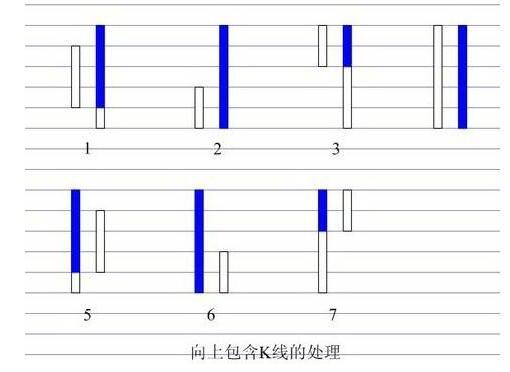 1、K線的包含關(guān)系: 一根k線的高低點(diǎn)(不分上影線和下影線)全部在其相鄰k線的高低點(diǎn)范圍之內(nèi),那么這根K線其相鄰k線就為包含關(guān)系 。K線的包含關(guān)系的處理原則:如果一K線的高低點(diǎn)全在另一線的范圍里,這種情況下,可以這樣處理,在向上時(shí),把兩K線的最高點(diǎn)當(dāng)高點(diǎn),而兩K線低點(diǎn)中的較高者當(dāng)成低點(diǎn),這樣就把兩K線合并成一新的K線;反之,當(dāng)向下時(shí),把兩K線的最低點(diǎn)當(dāng)?shù)忘c(diǎn),而兩K高點(diǎn)中的較低者當(dāng)成高點(diǎn),這樣就把兩K線合并成一新的K線。經(jīng)過(guò)這樣的 處理,所有K 線圖都可以處理成沒(méi)有包含關(guān)系的圖形。