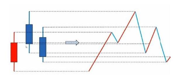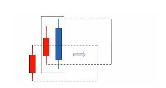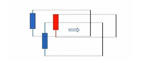 在上升趨勢(shì)中,把兩K 線的最高點(diǎn)當(dāng)高點(diǎn),而兩K線低點(diǎn)中的較高者當(dāng)成低點(diǎn),這樣就把兩K線合并成一新的K線 。