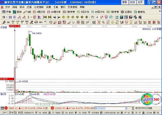 如下圖案例*ST東鉭(000962)在2000年1月20日上市,開(kāi)盤價(jià)24.4元便成為最低價(jià),當(dāng)日強(qiáng)勢(shì)上攻,以幾乎最高價(jià)33.08元報(bào)收,成交4500萬(wàn)股,約占流通盤6500萬(wàn)股的70%,明顯屬于主力資金的拉高建倉(cāng)行為,第二天低開(kāi)高走,以光頭的陽(yáng)線報(bào)收。至此,可基本確定為一頭短線瘋牛,投資者即可及時(shí)跟進(jìn),其后短短數(shù)天升幅高達(dá)50%。