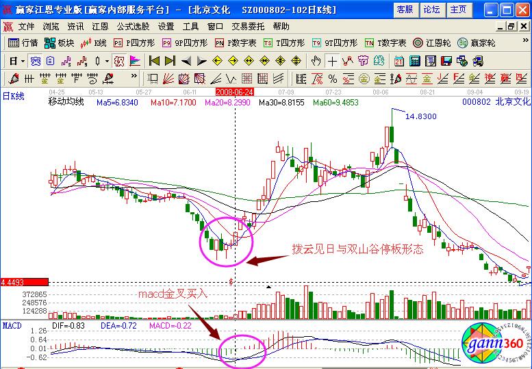 具體的實戰(zhàn)案例如圖北京文化(000802)在2008年6月底的股價走勢,在日K線中形成的是連續(xù)下跌的走勢,6月24日的時候形成了撥云見日與雙山谷停板的形態(tài),并且最后一個漲停板的形態(tài)包含了最大的陰線實體,并且上漲的幅度在5%以上,對應(yīng)的macd指標(biāo)形成的也是金叉買入的信號,大膽的投資者可以在該位置進(jìn)行短線介入。