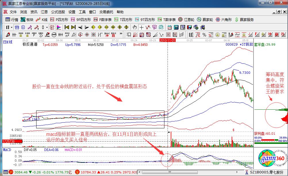 如圖000629的個(gè)股走勢形態(tài),在2010年到2011年初的整體運(yùn)行走勢,股價(jià)一直處于生命線的附近運(yùn)行,并且是在低位進(jìn)行的橫盤整理形態(tài),量能也沒有太大的變化,但是在股價(jià)進(jìn)入10年11月初運(yùn)行的時(shí)候,股價(jià)向上拉升在生命線上方運(yùn)行,量能有所變化,macd指標(biāo)兩線形成的了金叉買入的操作信號,該股的籌碼形態(tài)比較集中,符合螺旋槳王的K線形態(tài),大膽的投資者可以進(jìn)行操作。