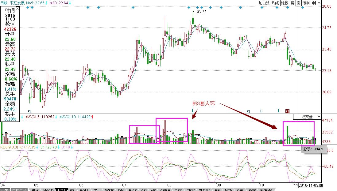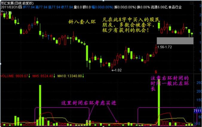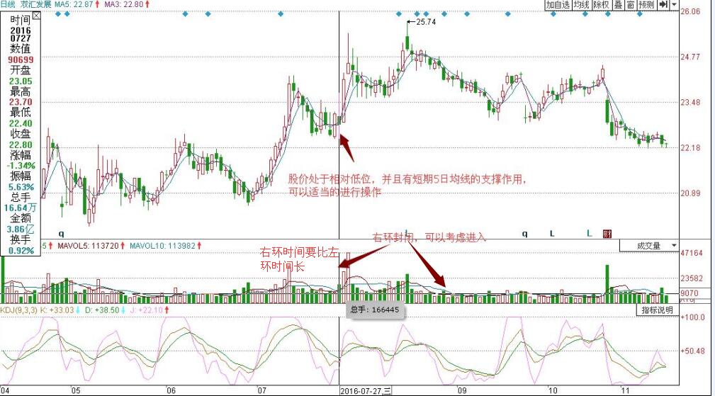以2016年7月27日形成的斜8套人環(huán)為例進(jìn)行分析,前期股價(jià)經(jīng)過一個小幅的下跌走勢,在7月27日的時候形成一個反彈上漲的低點(diǎn),并且股價(jià)處于相對低位,股價(jià)回踩5日均線作為上漲支撐,同時斜8套人環(huán)右環(huán)封閉,kdj指標(biāo)形成的是金叉買入的操作信號,投資者可以做短線操作,但是千萬不要在8字中進(jìn)行操作,因?yàn)楸惶椎目赡苄员容^大,可以在第一天介入,均線出現(xiàn)下跌回調(diào)的時候,及時的賣出獲利。