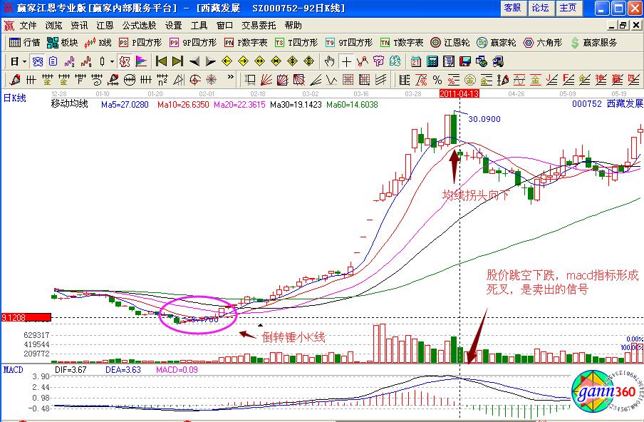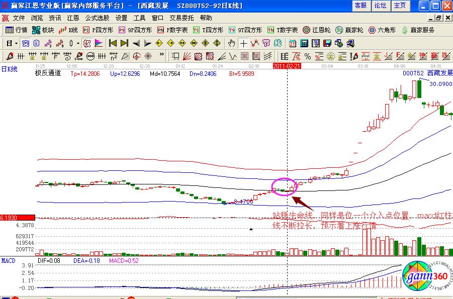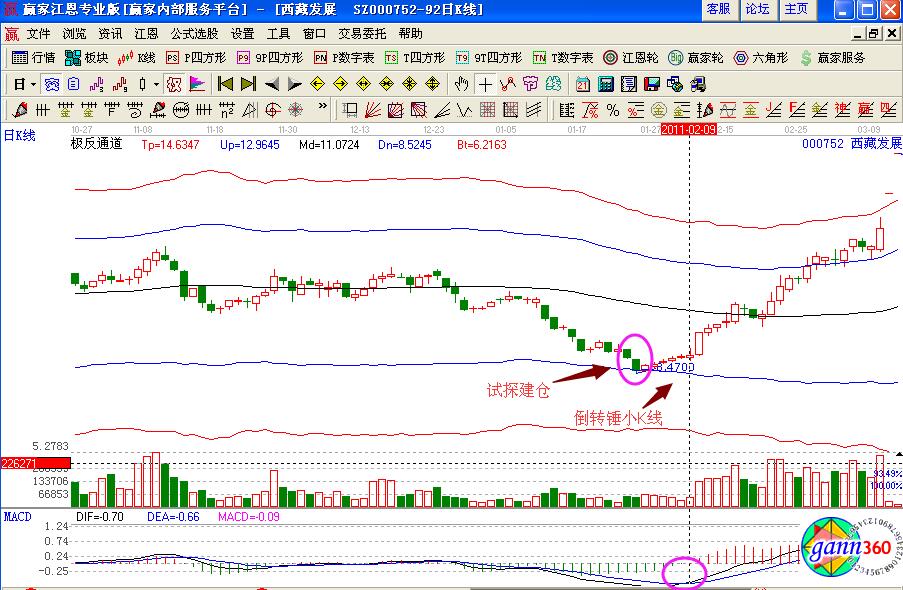 個(gè)股的走勢形態(tài)是通過案例進(jìn)行分析的,同樣的倒轉(zhuǎn)錘小K線也是同樣的道理,如圖西藏發(fā)展(000752)在2011年2月初的股價(jià)走勢,是在極反通道藍(lán)色下軌線的位置,獲得支撐是一個(gè)試探性介入的點(diǎn)位,之后股價(jià)形成了連續(xù)向上拉升的幾個(gè)小陽線,同時(shí)形成的是倒轉(zhuǎn)錘小K線具有一定長度的上影線,其量能的走勢比較平緩,次日股價(jià)向上拉升形成漲停板,是投資者要捕捉的漲停板走勢形態(tài),同時(shí)macd指標(biāo)形成了金叉買入的操作信號,可以積極的進(jìn)行買入操作,但是生命線下方是弱勢區(qū)域,倉位不要過重。