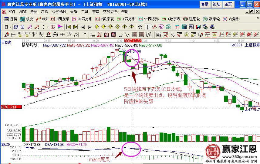 如圖上證指數(shù)在2007年10月份的走勢(shì)變化,指數(shù)經(jīng)過(guò)上漲拉升到達(dá)6124.04的高點(diǎn)之后,開(kāi)始下跌回落,此時(shí)5日均線下穿10日均線形成了高位的一個(gè)死叉,是賣(mài)出的信號(hào),說(shuō)明前期的走勢(shì)已經(jīng)形成了一個(gè)階段的高點(diǎn);