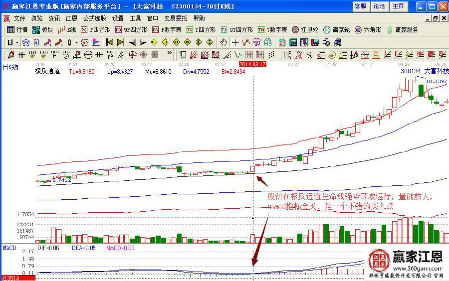 如果投資者不放心買點(diǎn)的位置,可以通過贏家江恩的極反通道進(jìn)行研判,如圖在14年3月17日的時候,股價以漲停陽線站穩(wěn)生命線并向上拉升,在強(qiáng)勢區(qū)域中運(yùn)行,量能不斷的放大,macd指標(biāo)金叉,是一個不錯的買入點(diǎn)位置。