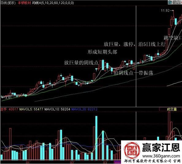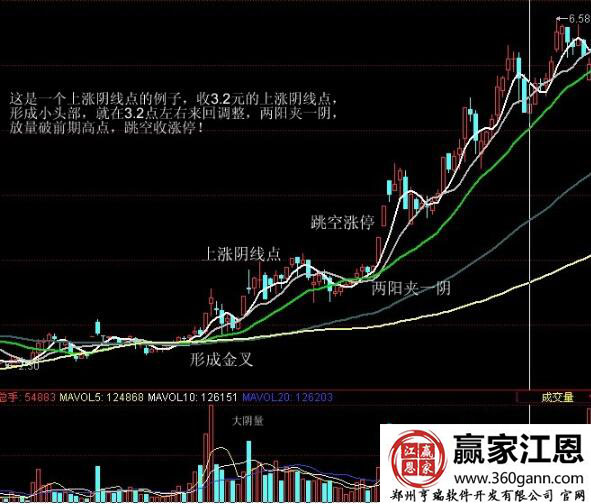如圖該股在2007年1月份的走勢(shì)變化,股價(jià)從低位開始拉升上漲,在收出3.2元的時(shí)候形成上漲陰線點(diǎn),并且出現(xiàn)小頭部形態(tài),在3.2元附近來回調(diào)整,在形成兩陽夾一陰K線組合形態(tài)之后,向上跳空漲停并且突破了前期的歷史高點(diǎn),也就是小頭部,投資者可以在出現(xiàn)上漲陰線點(diǎn)的位置積極的介入,等到股價(jià)上漲到6.58元時(shí)及時(shí)的賣出獲利,因?yàn)榇藭r(shí)該股的均線走勢(shì)開始拐頭向下預(yù)示著下跌的信號(hào);