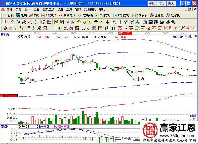 對(duì)比在極反通道中的走勢(shì)形態(tài),股價(jià)在2011年3月10日就已經(jīng)跌破了生命線(xiàn),向下運(yùn)行,進(jìn)入弱勢(shì)區(qū)間,是另一波下跌行情的開(kāi)始,此時(shí)投資者可以看出macd指標(biāo)死叉信號(hào)明顯,并且是在低位運(yùn)行,可以積極的考慮賣(mài)出行為。