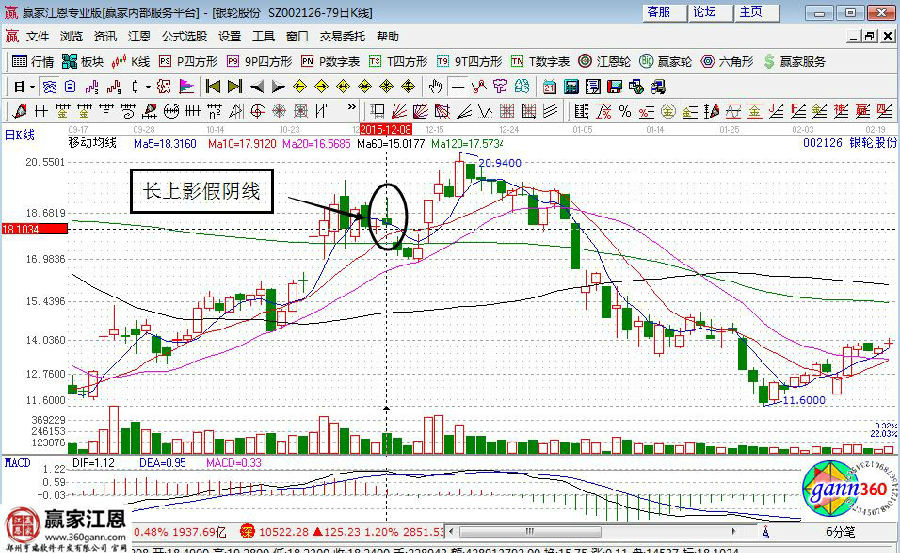 在2015年12月8日的時(shí)候,該股走出了一根長(zhǎng)上影的假陰線(如下圖),當(dāng)時(shí)自己看到這種走勢(shì)就會(huì)以為是拉高趕人的走勢(shì),就會(huì)非常感興趣,第二天很想短線介入,但是通過研判之前的銀輪長(zhǎng)上影所以選擇放棄,因?yàn)榍懊婷看伟殡S著長(zhǎng)上影的總是下跌。