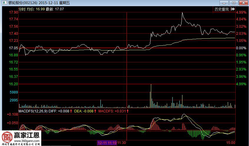 在跳空低開以后的第二天,12.10全天橫盤針對(duì)那個(gè)收陰線,估計(jì)這個(gè)時(shí)候有大部分的分析者會(huì)認(rèn)為是進(jìn)入到了陰跌通道了,所以離場(chǎng)情緒是非常濃厚的,而這之后的走勢(shì)就會(huì)更加的有趣了。下面是2015年12月11日的分時(shí)走勢(shì)圖。