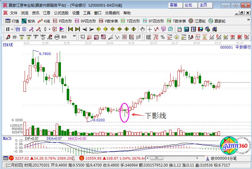 了解下影線測市法,首先要先了解什么是下影線。在k線圖中,下影線指的是從實體向下延伸的細(xì)線,如下面平安銀行走勢圖中所表示的K線。