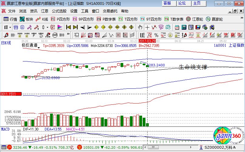 買入:個(gè)股達(dá)到了預(yù)期的支撐價(jià)位,做好買入準(zhǔn)備。但要進(jìn)一步保證買入的成功率,需結(jié)合具體的盤面走勢(shì)。若大盤當(dāng)日無(wú)大礙(上漲或震蕩),縮量跌到支撐位,盤口穩(wěn)健且日內(nèi)量、價(jià)、指標(biāo)等出現(xiàn)底背信號(hào),則直接掛單買入;反之,若大盤走弱,放量跌破預(yù)期價(jià)位,則不要急于買入,耐心等待市場(chǎng)給出穩(wěn)健的買入信號(hào)再行動(dòng)。如現(xiàn)在上證指數(shù)在極反通道指標(biāo)的生命線位置就是支撐位,如果跌破那么就要進(jìn)入到弱勢(shì)了。