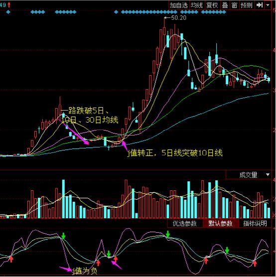在kdj中,j值反應(yīng)最快,在做判斷的時候,更要關(guān)注j值的變化。當(dāng)股價連連跌破5日線、10日線以致20日線的時候。在第一次跌破20日線的時候一般為階段性底部,此時一旦j值在零軸以下,出現(xiàn)負(fù)值,此時我們應(yīng)該尤為關(guān)注。當(dāng)股價再次向上突破5日線的時候,股價必然會創(chuàng)出新高。而我們在這反彈到前高附近的利潤就可以拿到手。這個方法對于連續(xù)下跌的股票概率會更大。下面我們看這個股票。