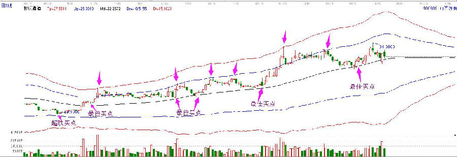 4.對(duì)選出來(lái)的量比大的個(gè)股,做好技術(shù)分析,均線系統(tǒng)也好,MACD分析也好或是其他的分析方法,當(dāng)技術(shù)分析上,個(gè)股也符合操作的條件,那成功率當(dāng)然更高。贏家江恩軟件的快速篩選個(gè)股工具為極反通道,即生命線(中間黑色曲線)附近為最佳買(mǎi)點(diǎn)。如下面山西汾酒的走勢(shì)圖,歷史上很多次的拉升,都可以看做是從生命線開(kāi)始的,到達(dá)壓力位不突破,形成賣(mài)點(diǎn).