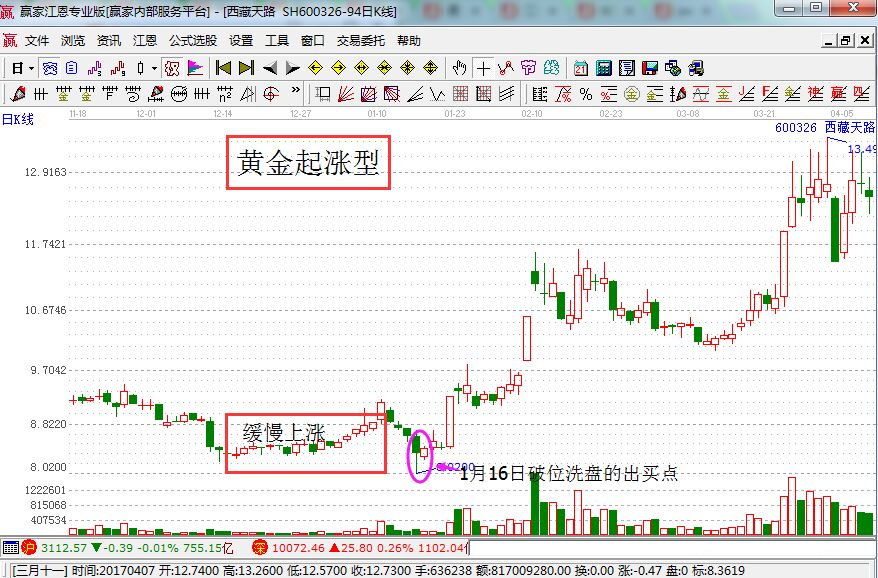 西藏天路就是在一帶一路、水泥板塊和黃金板塊的混合概念,主力資金介入比較深,本年度1月16日,黃金起漲模型提示主力資金介入,并提示買點(diǎn),其后該股便走了幾個(gè)波段的漲幅。