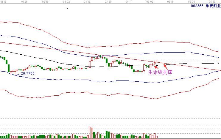 從上面的圖形我們可以看到這只個股非常的符合極反通道走勢,而且在大盤下跌有一段時(shí)間后,接近藍(lán)色下軌線支撐附近的時(shí)候,這只股仍然是處于生命線位置震蕩,在趨勢上是強(qiáng)于很多個股的,大盤一旦反彈,這種個股也是非??焖俚母S者,那為了確認(rèn)趨勢的轉(zhuǎn)變,可以在畫出一條趨勢線作為趨勢轉(zhuǎn)變的輔助分析,入上圖所示,顯然調(diào)整位置到達(dá)生命線收回,并且重新站回趨勢線之后,在5月10日型號曾了共振點(diǎn),開始了這波上漲。