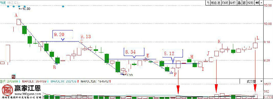 同樣的,從E柱到F柱,跌幅不足10個點,那就必須要按照31位來進行計算了,因此F柱體之后的止跌反彈那,高度應(yīng)該在8.12元左右,從它后來真正的陽實頂,則是8.22元站在了31位之上,顯然是非常典型的凹間峰的走勢。