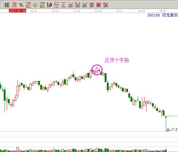 十字胎表示的是跟孕線一樣的走勢,跟上面的早晨之星和黃昏之星的區(qū)別在于,十字星包含前一根K線的實(shí)體之內(nèi)。同樣是出現(xiàn)在股票走勢的底部或者頂部。此種類型的走勢出現(xiàn)頻率較少,在實(shí)戰(zhàn)走勢的反轉(zhuǎn)準(zhǔn)確率低于上述的十字星,需要結(jié)合后市走勢K線進(jìn)行判斷。