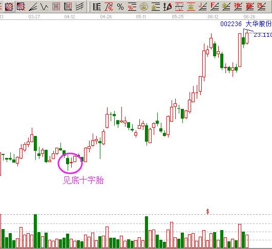 在下跌時(shí)候出現(xiàn)中大陰線,隨后出現(xiàn)跳空高開并出現(xiàn)十字走勢,為重要的見底信號。