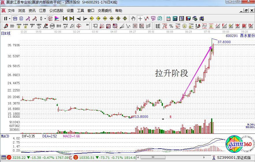 我們知道莊家在拉升的階段,成交量一般會呈現(xiàn)大幅的放大,當然這也就是平常我們所說的量價齊升,呈現(xiàn)的是逐步遞增的走勢,能量上是逐步得到了聚焦,所以相對來說市場是活躍的。當然在日K線上的表現(xiàn),那么就是股價節(jié)節(jié)拔高,走勢好像是破土的竹子。如下面的西水股份就處在拉升的階段之中。
