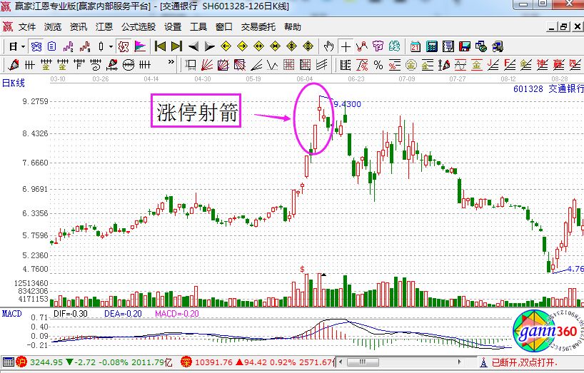 漲停射箭是什么?它指的就是高位漲停之后,莊家進(jìn)行出貨手法。具體的介紹就是,股價(jià)在經(jīng)過一段時(shí)間的上升,創(chuàng)出階段新高,拉出漲停板之后,第二天的走勢是沖高回落,而且連帶著收出的是帶長上影線的小陽線或者是小陰線,同時(shí)成交量是大幅的放大,如下面的交通銀行走勢圖。