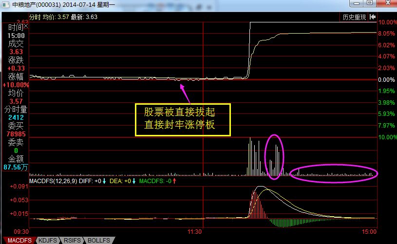 中糧地產(chǎn)在2014年7月14日的分時(shí)圖中,無盤之后,市場(chǎng)就傳出了這只股有重組的預(yù)期,隨后,該股就出現(xiàn)了旱地拔蔥的直線封板走勢(shì),而且在封上漲停板之后,個(gè)股直接封牢,在沒有進(jìn)行開盤。