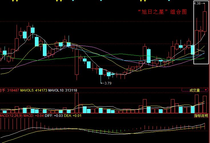 旭日之星形態(tài)是什么?從K線的數(shù)量上來看的話,它其實(shí)是由三根陰陽線所組成的,即第一根陽線相對比較長,第二根K線為類似的倒?fàn)铄N子或者是流星的小實(shí)體K線,第三根同樣為陽線,并且是中陽線,如下圖所示。