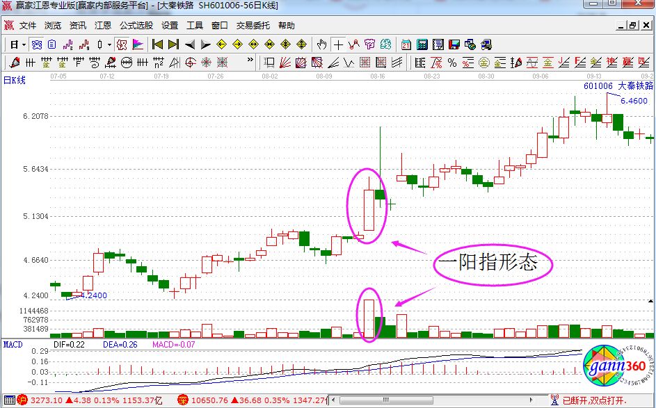 什么是K線形態(tài)?它其實指的就是一根平底的大陽線,當然它的自身的條件就是巨幅低開。因為這樣的大陽線之后,一般都會伴隨著非常不錯的機會。如果是在相對低位出現(xiàn)一陽指并且來量能也是巨放且連續(xù)量能比較強的話,那么在一陽指成形的時候或者次日逢低進行建倉,這是個對于抓連續(xù)大陽勝算是比較大的。具體大家可以參考下圖中的一陽指來進行辨別。