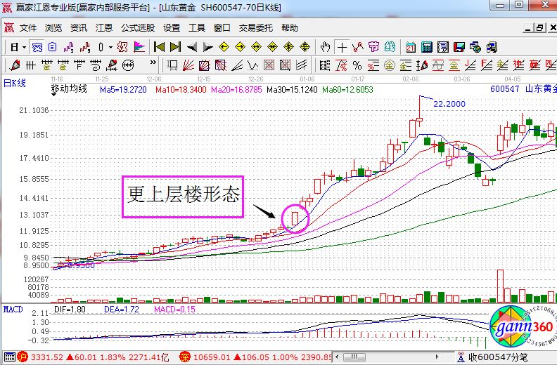股票更上層樓是什么樣的?它其實指的就是股價在沿著上升通道運行,在接近歷史高點的位置,采取漲停板的方式進行刷新歷史,并且創(chuàng)出新的高點,所以這樣的形態(tài)就是我們經(jīng)常所說的加速K線組合,因為它非常像“欲窮千里目,更上一層樓”,所以這樣的走勢形態(tài)就被稱作了更上層樓形態(tài)。如下面的山東黃金的走勢圖。