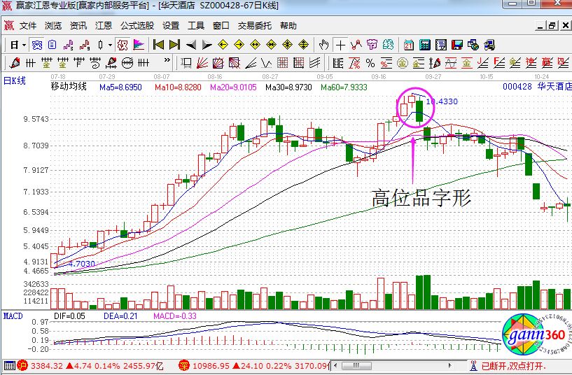 高位品字形是什么?它其實(shí)與黃昏之星形成的機(jī)理和內(nèi)涵基本上一只,但是不同的是第二根K線(xiàn)不要裘缺口、十字星、星形線(xiàn)這種極度收斂的形態(tài),一般來(lái)說(shuō)小陽(yáng)線(xiàn)、小陰線(xiàn)的出現(xiàn)次數(shù)最多,偶爾有中大養(yǎng)心啊或者陰線(xiàn),這種形態(tài)的第二根K線(xiàn)判斷頭部的意義并不明顯,一般都要等到第三根中大陰線(xiàn)的時(shí)候才能判別頭部基本上形成,如下圖所示。