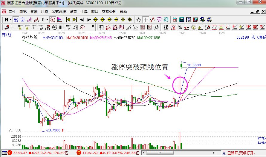通過(guò)對(duì)于股票的研究,小編發(fā)現(xiàn)漲停最容易出現(xiàn)在突破下降壓力線位置、突破重要的頸線位置,當(dāng)然還要突破上升通道上軌、改變上升速率的位置、均線多頭(30日線)的挖坑位置。顯然位置是非常重要的,但是對(duì)于關(guān)鍵的起漲點(diǎn)也是需要消息的刺激的,這樣才能夠狙擊成功。