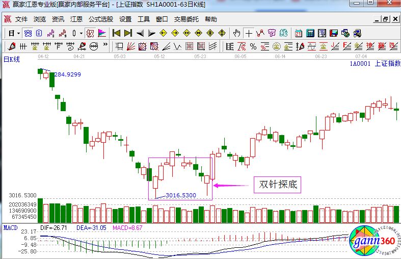 雙針探底信號強(qiáng),影線越長頭越昂;頂部出現(xiàn)射擊星,手中籌碼趕快清;