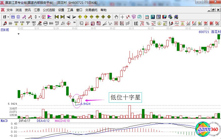 對(duì)于十字星的形態(tài),大家已經(jīng)了解果很多了,一般這個(gè)形態(tài)是出現(xiàn)在下跌趨勢(shì)中,出現(xiàn)上影線和下影線均比較長(zhǎng)的K線,它的形態(tài)就好像是一顆十字星,這就是典型的低位十字星。如下圖所示。