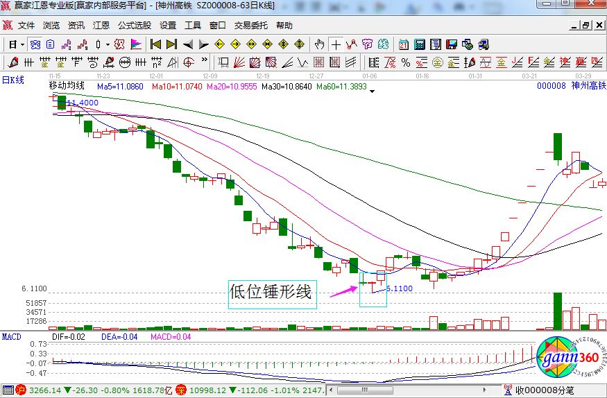 股價(jià)一般在下跌趨勢(shì)中,出現(xiàn)下影線比較長(zhǎng)上影線比較短的K線形態(tài),這樣的形態(tài)就好像是一把錘子,所以就是低位錘形線,如下圖所示。
