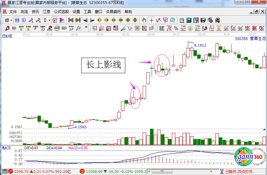 根據(jù)出現(xiàn)的位置不同,長上影線的含義也是不同的,例如,在上升趨勢的高位出現(xiàn),同時成交量放大,那么就會意味著多頭追高積極,但是高位拋壓是比較沉重的,價格向上攀越是很艱難的,行情很有可能掉頭回檔或者反轉(zhuǎn)。