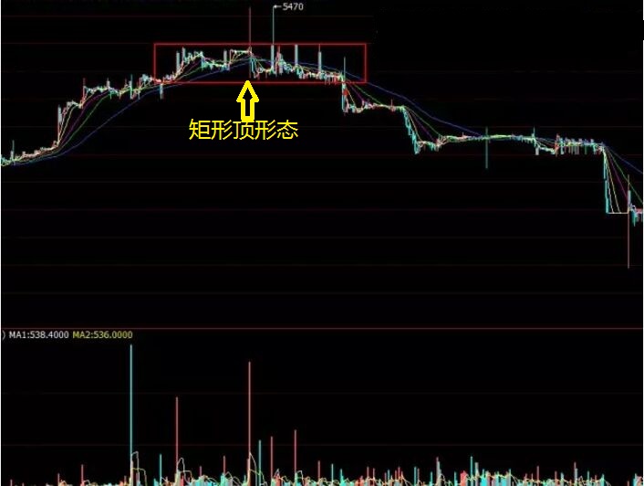 股價在經(jīng)過連續(xù)大幅拉升后,獲利的多頭想要高位出局,就不能采取短時間大量出貨的方式賣出,因?yàn)槿绻菢幼龅脑捫螒B(tài)就會完全被破壞,這樣就無法完成高位出貨的任務(wù),所以只能采取這樣長時間、小心翼翼緩緩賣出的形式,從而在形態(tài)上就形成了矩形頂,一旦獲利的多頭出貨接近結(jié)束,多頭便會采取砸盤的形式出逃,于是箱體的下沿就被跌破了,矩形頂也就形成了。